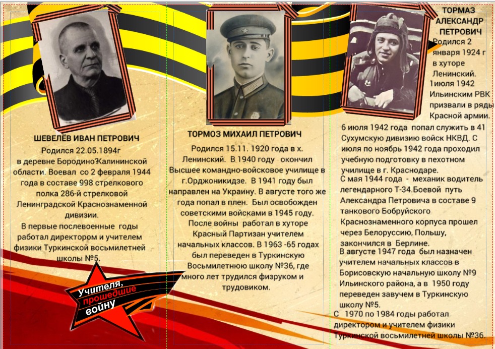 В рамках культурно-просветительского проекта «И к свету нас ведут познанья» и года "Педагога и наставника" Туркинская библиотека, филиал №1 подготовила буклет "Учителя-фронтовики"., который знакомит с педагогами х.Туркинский -участниками Великой Отечественной войны В годы Великой Отечественной войны сотни тысяч педагогов сражались на боевых фронтах, сменив привычные мел и указку на автоматы.А после Победы они с таким же энтузиазмом и огнем в глазах вернулись к своей мирной профессии – учить и воспитывать молодое поколение.