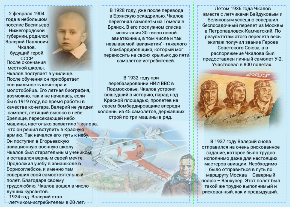 2 февраля 2024 года, исполнилось 120 лет со дня рождения известного по всему миру летчику-испытателя, героя Советского Союза, уроженца Нижегородской области Валерия Павловича Чкалова. Он в 1937 году совершил легендарный для авиации перелет без пересадки из Москвы в США через Северный полюс на самолете АНТ-25. Летчик Чкалов был известен своими смелыми и рисковыми трюками за штурвалом самолета. Он испытывал более 30 типов самолетов, включая бомбардировщики и экспериментальные машины. Чкалов прославился участием в первом в стране воздушном параде и получил множество почестей. Память о нем на века сохранили в названиях улиц, школ и воинских частей. Среди самых значимых достижений Чкалова два легендарных перелета через Северный полюс. Первый был совершен в 1935-м с Георгием Байдуковым и Александром Беляковым. Экипаж планировал перелет в США, но Сталин изменил маршрут, остановив их в Петропавловске-Камчатском. Тем не менее был установлен рекорд – беспосадочный путь длиной в девять тысяч километров за 56 часов. За этот подвиг Чкалов и его коллеги получили звание Героя СССР.