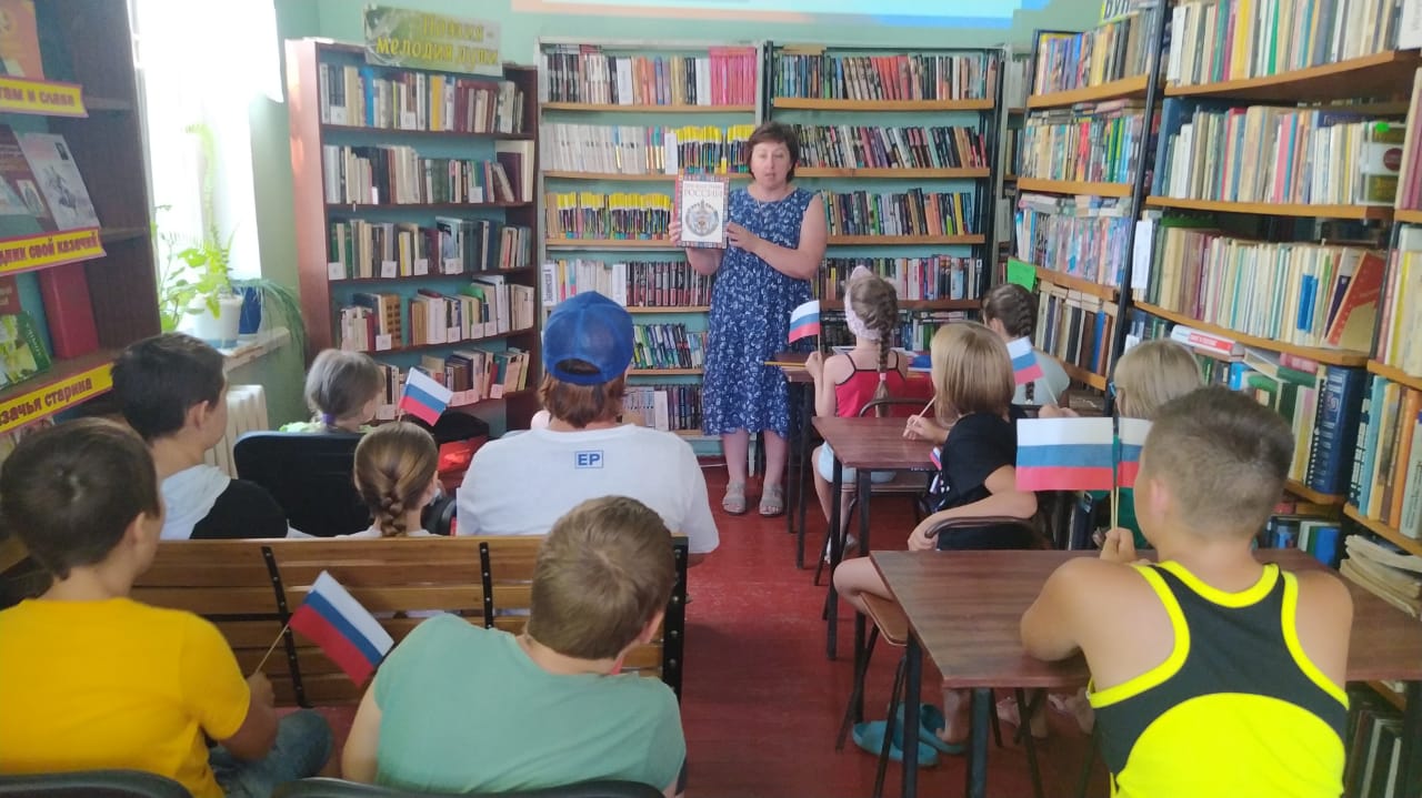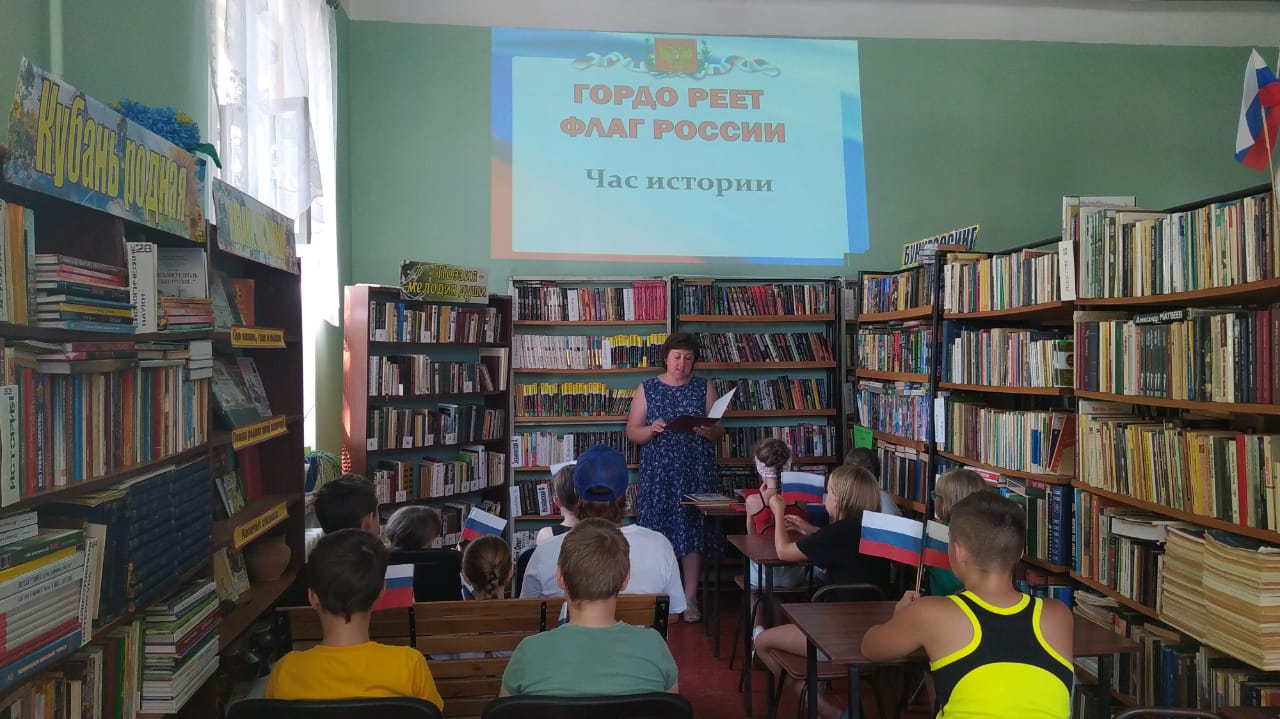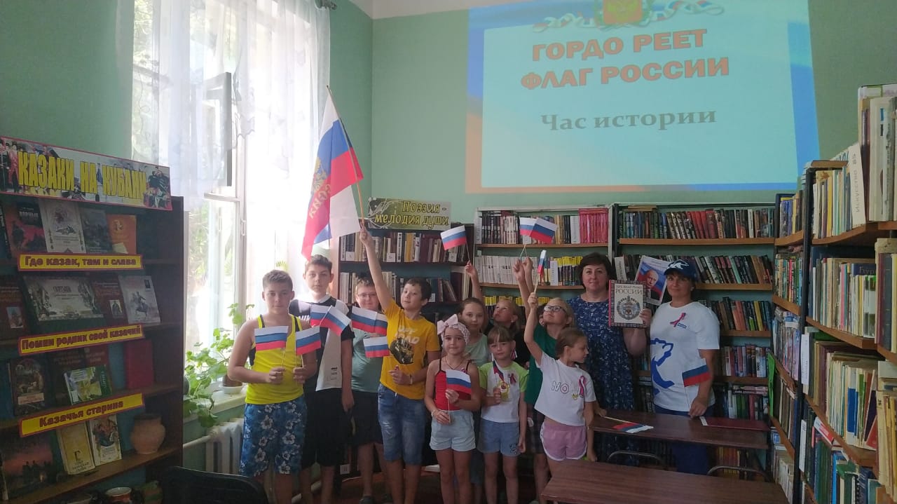 В Туркинской библиотеке, филиал №1 22 августа был проведен час истории "Гордо реет флаг России", посвящённый государственному празднику – Дню флага Российской Федерации.На фоне мультимедийной презентации ребята вспомнили историю российского флага, познакомились с государственной символикой России, в которой отражаются мощь и величие нашей страны, ее славная история, подвиги российского народа. Библиотекарь наглядно показала, как изменялись цвета знамени российского государства и с чем были связаны такие перемены, познакомила юных читателей с книгами по истории Российского флага.