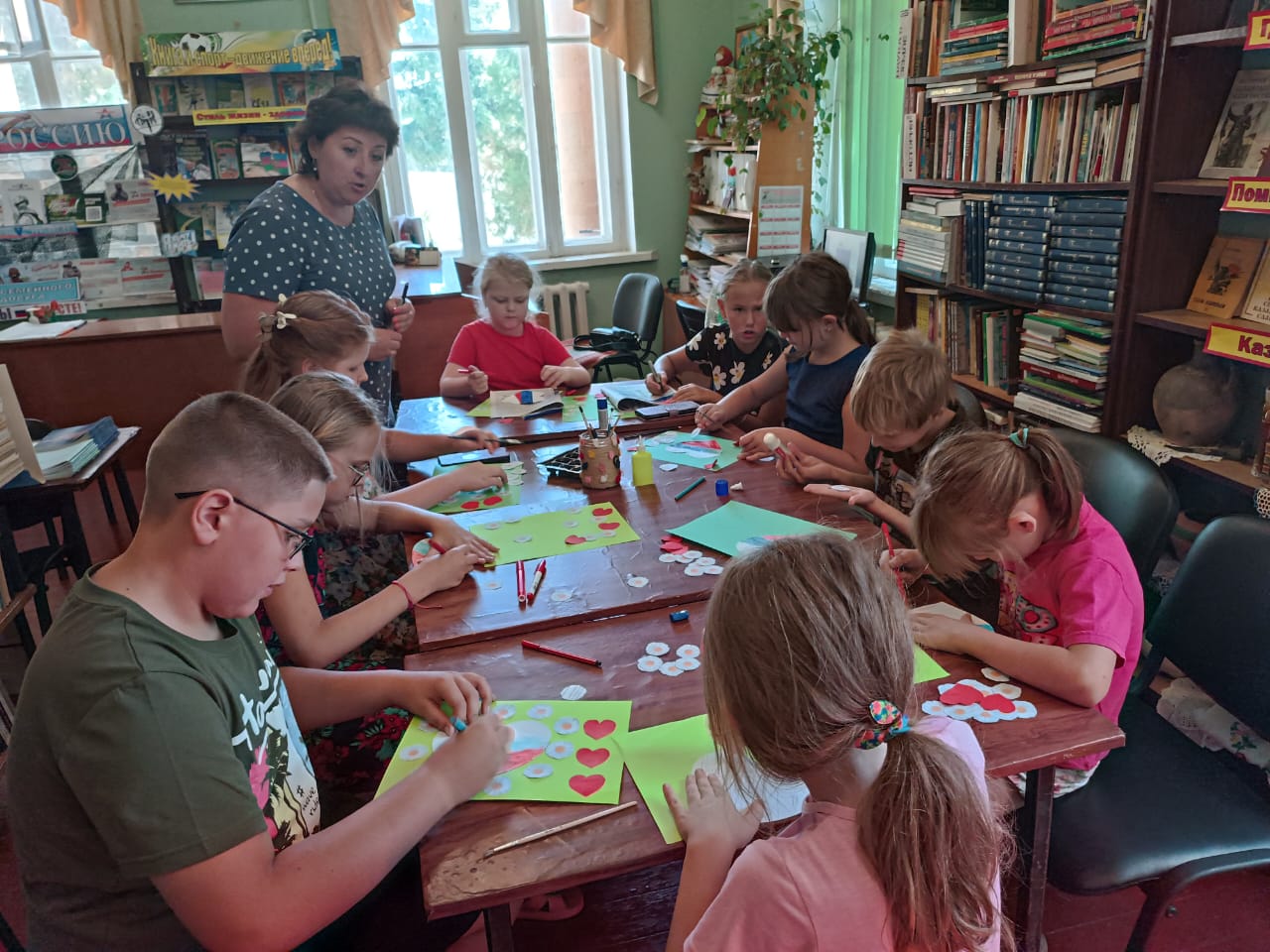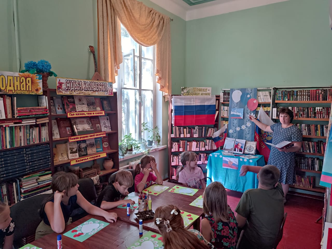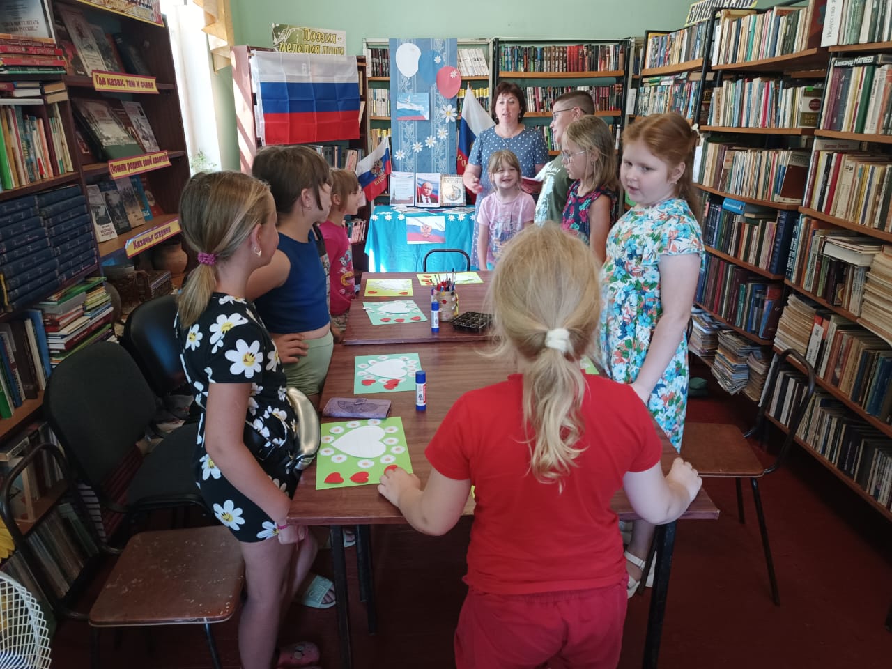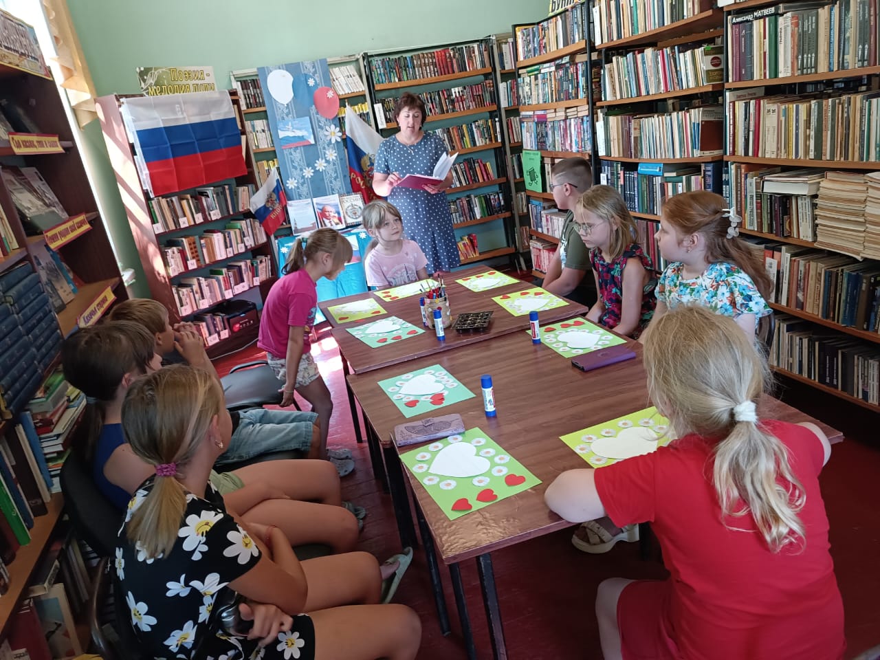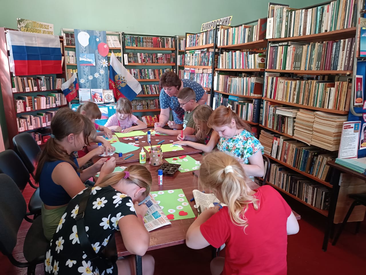 Затем участники мероприятия изготовили поделку из бумаги в цветовой гамме величественного флага России — бело–сине–красных тонах. С помощью цветной бумаги, клея и ножниц, ребята изготавливали аппликацию: флаги в форме сердца. В библиотеке к мероприятию был оформлен красочный тематический стенд.
