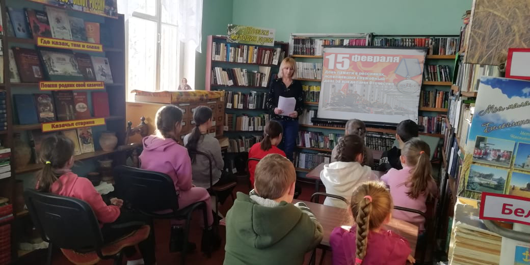 Сегодня в России отмечают День Памяти воинов-интернационалистов и 34-ую годовщину вывода Советских войск из Афганистана. 15 февраля 2023 г, в рамках военно-патриотического месячникаТуркинской библиотекой , филиал №1 был проведен час памяти и мужества «Долг и память», посвященный Дню памяти о российских военнослужащих, исполнявших интернациональный долг за пределами Отечества.Библиотекари познакомили читателей с историческими событиями войны в Афганистане, а также рассказали о том, как мужественно и профессионально выполняли свой долг наши солдаты в Афганистане и Чечне, как в сложнейших условиях проявляли стойкость и благородство, сохраняли верность военной присяге и долгу.Минутой молчания почтили память погибших воинов-интернационалистов.