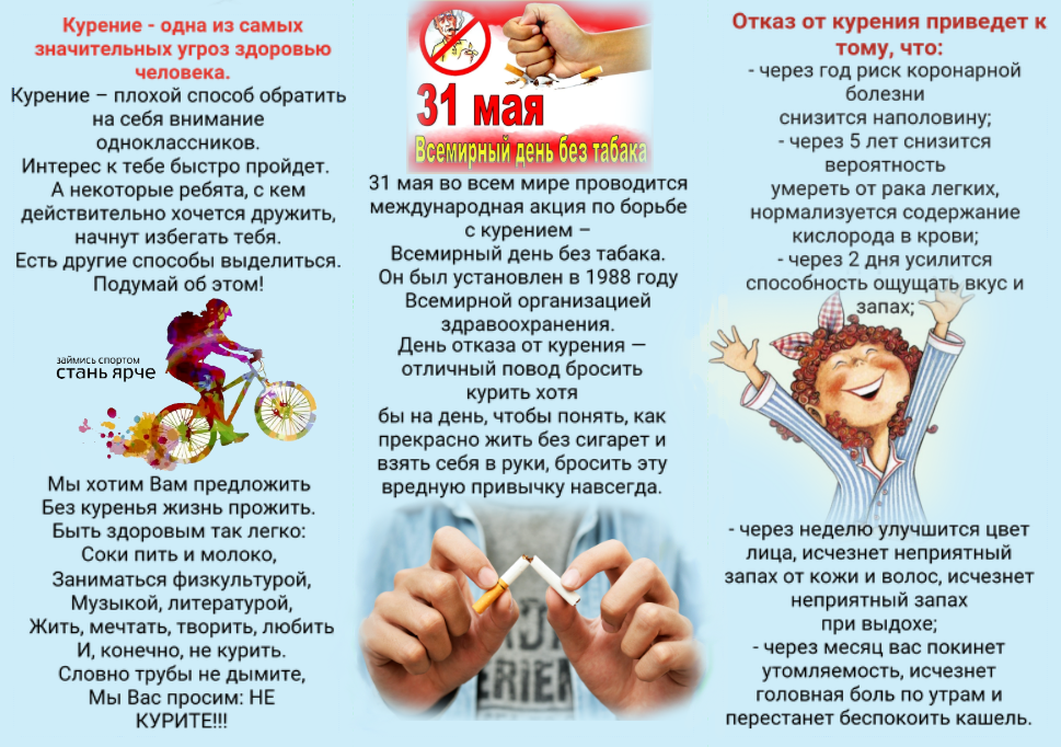 31 мая 2025 года отмечается Всемирный день без табака. Этот день направлен на повышение осведомлённости о вреде курения и продвижение здорового образа жизни. Тема Всемирного дня без табака 2025 года — «Разоблачим уловки манипуляторов!».