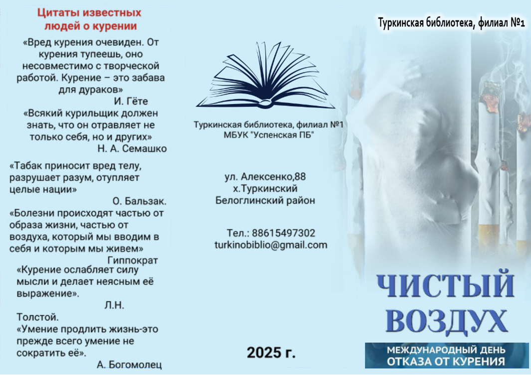 29 мая 2025г в рамках Всемирного дня без табака Туркинская библиотека, филиал№1 провела стрит-акцию «Чистый воздух». В ходе акции участникам рассказали о влиянии никотина на организм человека, как влияет дым от сигареты на окружающих, некурящих людей, почему не стоит начинать и необходимо бросить курить. Проинформировали о стратегиях, которыми пользуются производители табачных и никотинсодержащих изделий для того, чтобы сделать свою вредную для здоровья продукцию более привлекательной, в первую очередь – для молодежи.