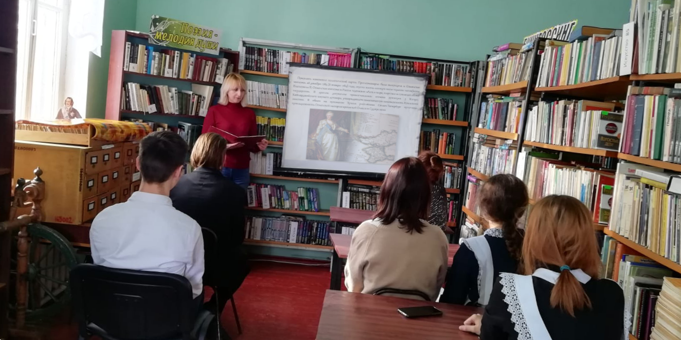 Библиотекарь рассказала об историческом документе – Манифесте, принятом императрицей Екатериной II в 1783 году, о вхождении Крымского полуострова, Тамани и Кубани в состав Российской империи, которое определилось в ходе кровопролитий русско-турецких войн ХVII-ХIХ веков. В ходе беседы ребята узнали об исторических событиях присоединения Крымского полуострова к Российской империи 1783 года, также об изменениях внутренней и внешней политики после подписания данного Манифеста и об активном развитии Крыма после воссоединения с Россией.